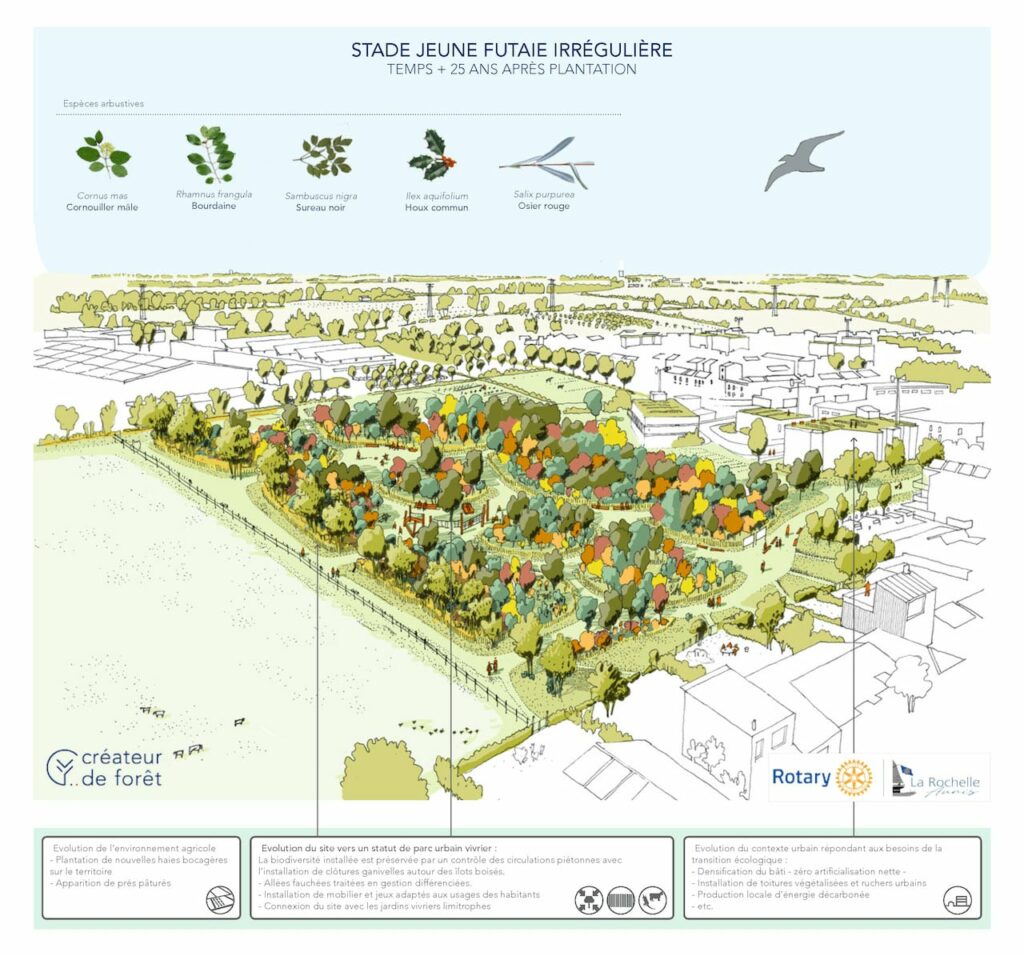 Ce projet est porté financièrement par le Rotary Club de La Rochelle Aunis qui a intégré dans sa stratégie le volet environnemental. Depuis 2021, l’association finance des actions qui renforcent la protection et la conservation des ressources naturelles, qui favorisent la pérennité écologique et l’harmonie entre les êtres humains et l’environnement. Afin de mener à bien ce projet, la ville et l’antenne rochelaise du Rotary se sont associées à Créateur de forêt qui assure le rôle de maître d’oeuvre.